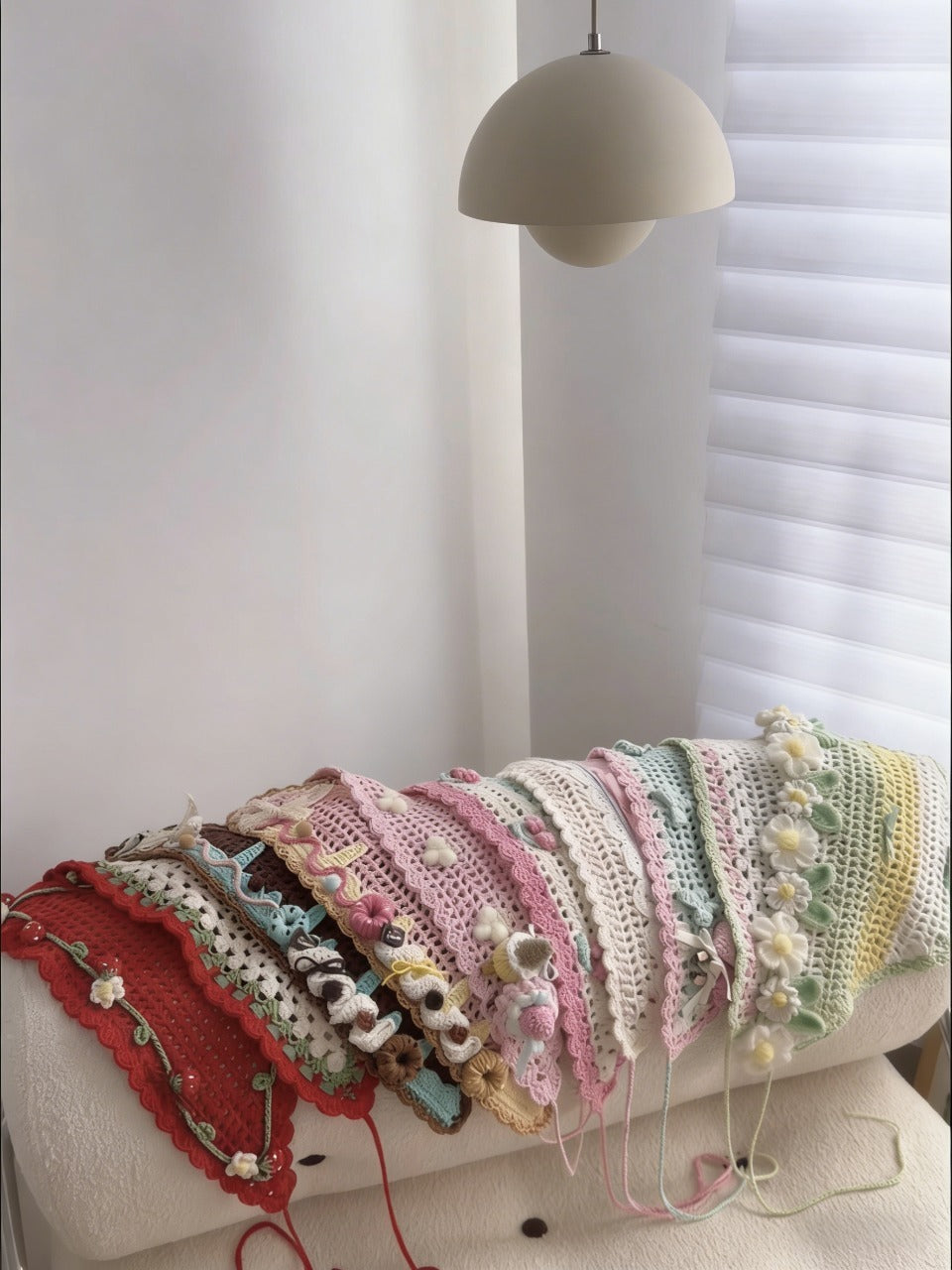 This sweet crochet triangle headscarf is handmade with soft milk cotton yarn, giving it a comfortable, breathable texture that is perfect for daily wear. The delicate crochet stitches and charming decorative details create a soft cottagecore aesthetic, making it a lovely accessory for spring and summer outfits.